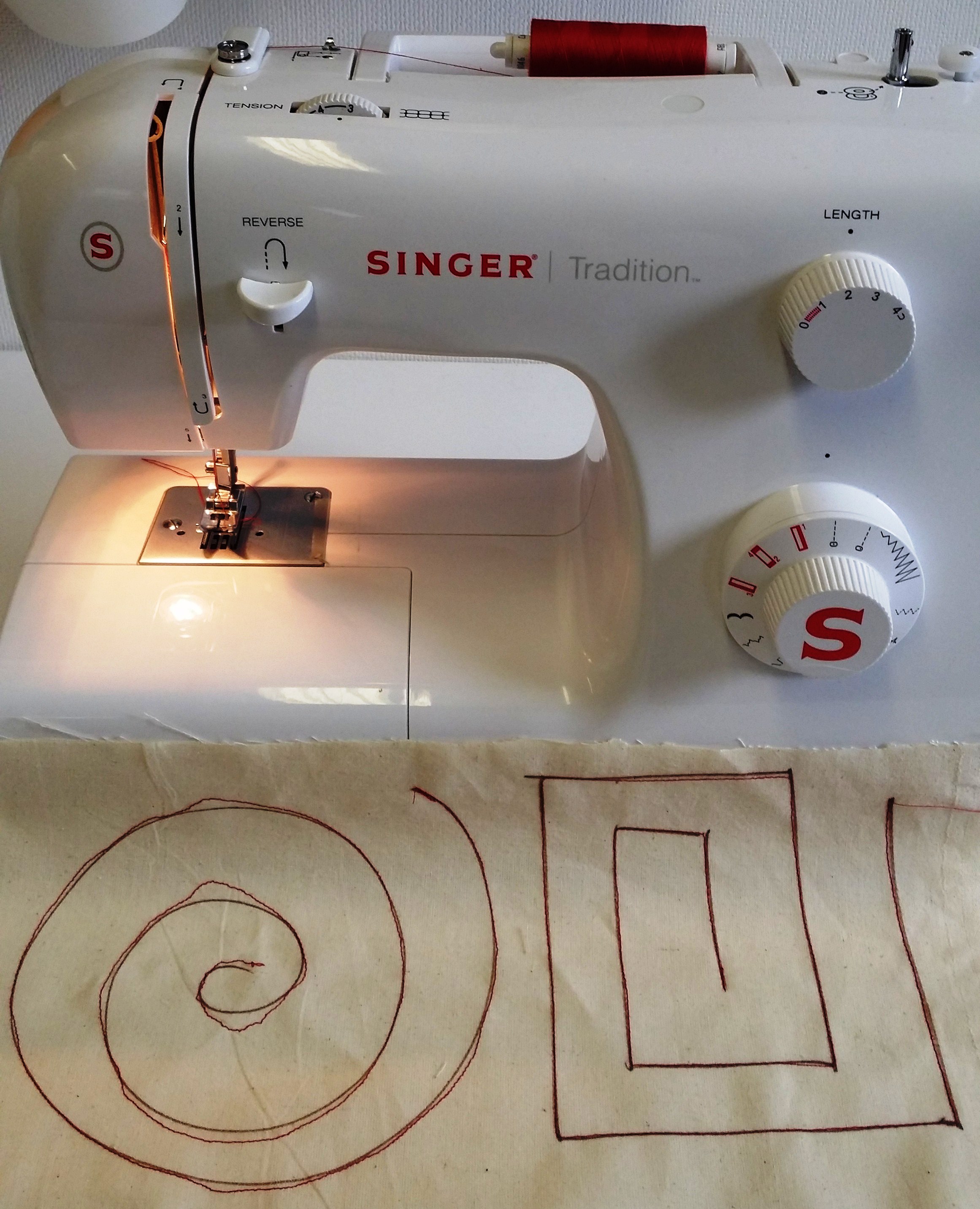 sewing on square and round spiral patterns to navigate the controls, speed and corners. The bit that holds the fabric in place around the needle is called a ‘foot’ and is exchangeable depending on the type of fabric and stitchwork. In order to do flawless corners you’ll need to lift the foot to free the fabric to rotate it evenly, but want it back in place during the straight lines.